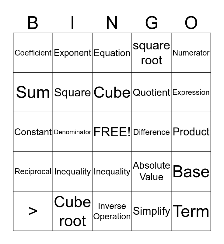 This bingo card has a free space and 24 words: Inequality, Cube root, Cube, >, Numerator, Coefficient, Sum, Exponent, Difference, Inequality, Quotient, Constant, Absolute Value, Base, Square, Simplify, Product, Equation, Expression, Denominator, Term, Reciprocal, square root and Inverse Operation.