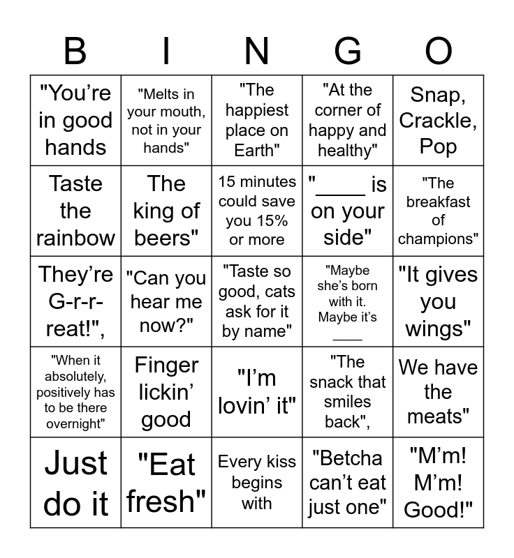 This bingo card has 25 words: Finger lickin’ good, Every kiss begins with, 15 minutes could save you 15% or more, Just do it, Snap, Crackle, Pop, "You’re in good hands, Taste the rainbow, "Melts in your mouth, not in your hands", "Maybe she’s born with it. Maybe it’s ____, "I’m lovin’ it", "____ is on your side", They’re G-r-r-reat!",, "The snack that smiles back",, We have the meats", The king of beers", "M’m! M’m! Good!", "It gives you wings", "The happiest place on Earth", "The breakfast of champions", "Can you hear me now?", "Taste so good, cats ask for it by name", "Eat fresh", "When it absolutely, positively has to be there overnight", "At the corner of happy and healthy" and "Betcha can’t eat just one".