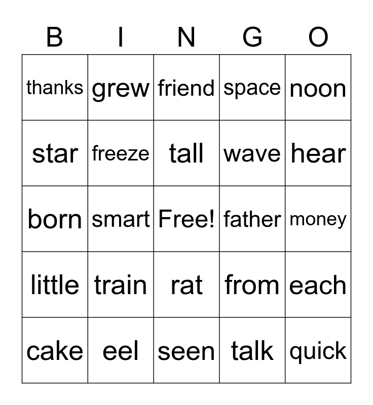 This bingo card has a free space and 24 words: train, eel, tall, cake, noon, thanks, star, grew, father, rat, wave, born, from, each, freeze, talk, money, friend, hear, smart, quick, little, space and seen.