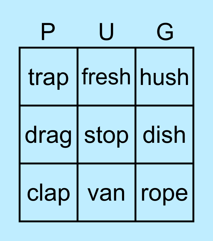 This bingo card has a free space and 15 words: slime, tug, hush, trap, van, rope, plan, game, dish, bone, fox, drag, clap, fresh and pile.