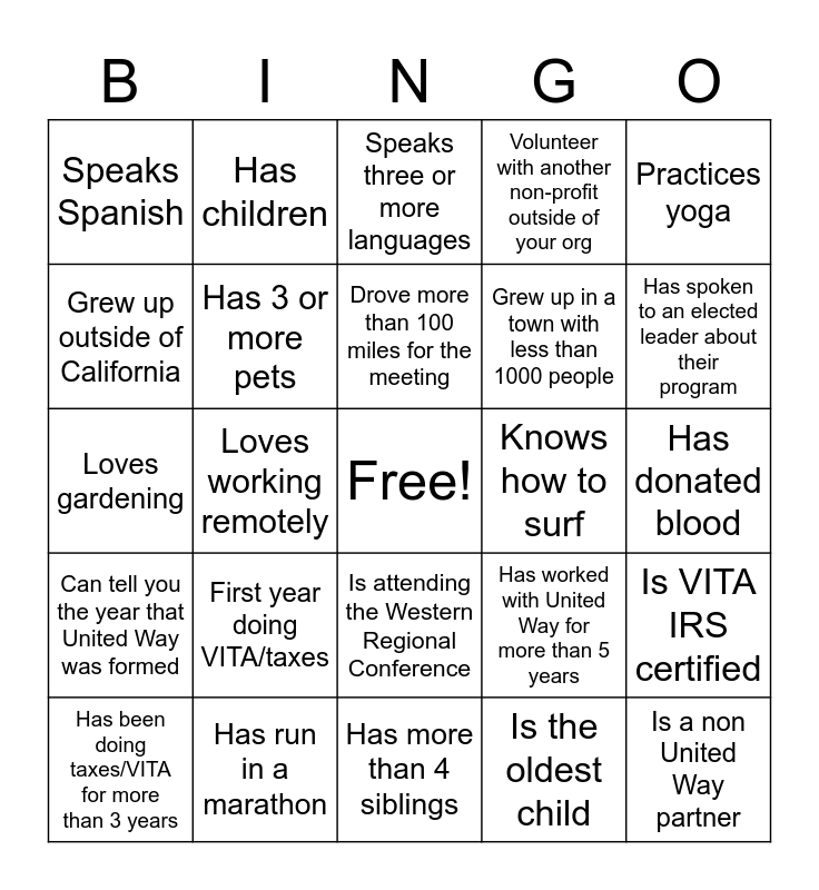 This bingo card has a free space and 24 words: First year doing VITA/taxes, Has run in a marathon, Drove more than 100 miles for the meeting, Has been doing taxes/VITA for more than 3 years, Practices yoga, Speaks Spanish, Grew up outside of California, Has children, Knows how to surf, Is attending the Western Regional Conference, Grew up in a town with less than 1000 people, Loves gardening, Has worked with United Way for more than 5 years, Is VITA IRS certified, Has 3 or more pets, Is the oldest child, Has donated blood, Speaks three or more languages, Has spoken to an elected leader about their program, Loves working remotely, Is a non United Way partner, Can tell you the year that United Way was formed, Volunteer with another non-profit outside of your org and Has more than 4 siblings.