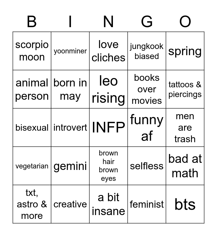 This bingo card has a free space and 24 words: gemini, creative, leo rising, txt, astro & more, spring, scorpio moon, animal person, yoonminer, funny af, brown hair brown eyes, books over movies, bisexual, selfless, bad at math, born in may, feminist, men are trash, love cliches, tattoos & piercings, introvert, bts, vegetarian, jungkook biased and a bit insane.