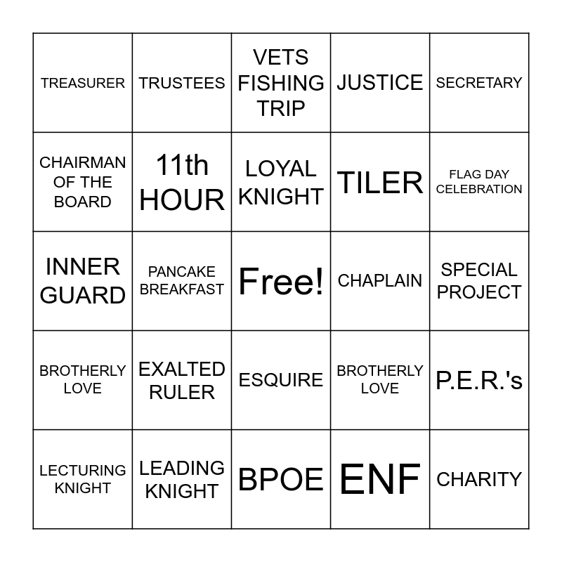 This bingo card has a free space and 24 words: EXALTED RULER, LEADING KNIGHT, LOYAL KNIGHT, LECTURING KNIGHT, SECRETARY, TREASURER, CHAIRMAN OF THE BOARD, TRUSTEES, CHAPLAIN, ESQUIRE, TILER, INNER GUARD, BROTHERLY LOVE, P.E.R.'s, 11th HOUR, ENF, SPECIAL PROJECT, VETS FISHING TRIP, FLAG DAY CELEBRATION, PANCAKE BREAKFAST, CHARITY, BROTHERLY LOVE, JUSTICE and BPOE.