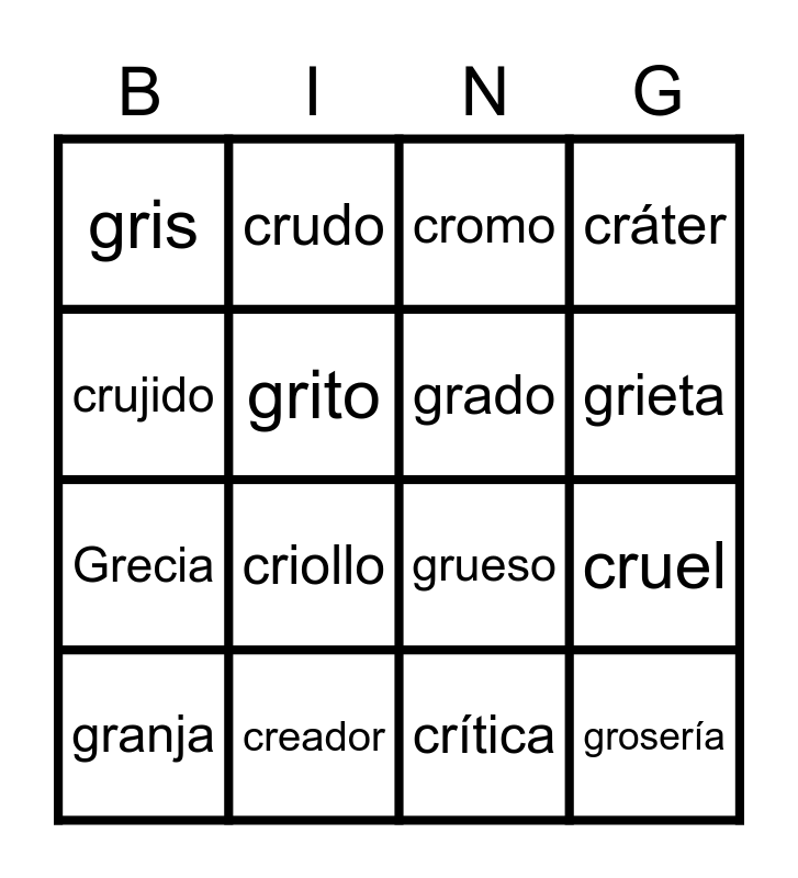 This bingo card has 28 words: gracias, criminal, Grecia, cráneo, grito, cromo, crudo, grosería, creador, grúa, grueso, cráter, cruce, grasa, criollo, creyente, grito, grado, grieta, gruñón, gris, granizo, granja, cruel, crítica, creativo, crujido and croar.