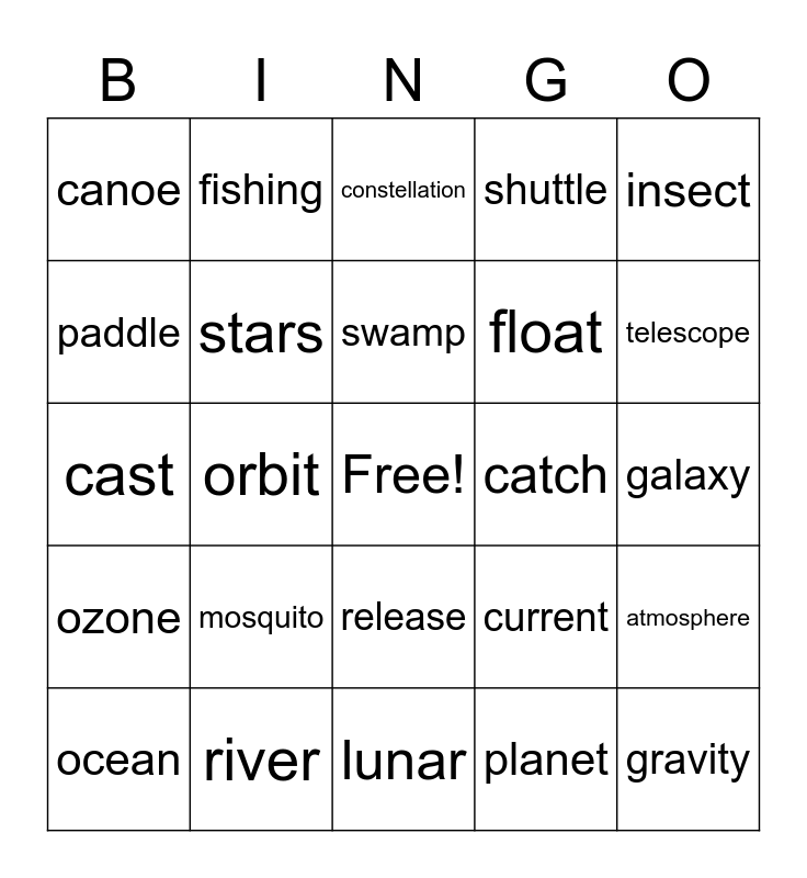 This bingo card has a free space and 24 words: mosquito, river, swamp, ocean, insect, canoe, paddle, fishing, catch, release, float, cast, current, atmosphere, stars, planet, galaxy, constellation, telescope, orbit, gravity, ozone, shuttle and lunar.