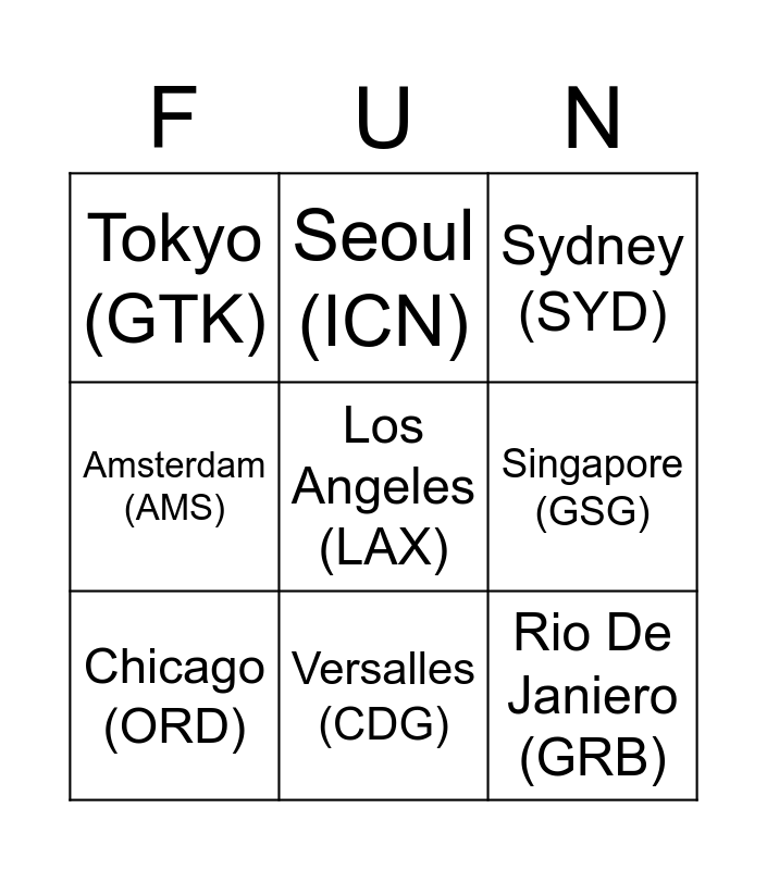This bingo card has a free space and 8 words: Singapore (GSG), Sydney (SYD), Seoul (ICN), Chicago (ORD), Tokyo (GTK), Rio De Janiero (GRB), Amsterdam (AMS) and Versalles (CDG).