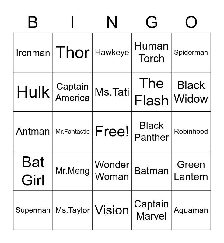 This bingo card has a free space and 24 words: Mr.Meng, Ms.Taylor, Ms.Tati, Superman, Spiderman, Ironman, Hulk, Thor, Black Panther, Wonder Woman, The Flash, Antman, Batman, Green Lantern, Captain America, Captain Marvel, Robinhood, Hawkeye, Black Widow, Mr.Fantastic, Aquaman, Bat Girl, Human Torch and Vision.
