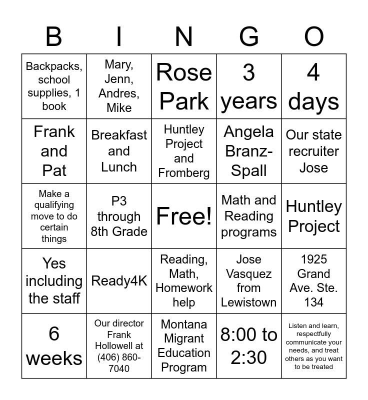 This bingo card has a free space and 25 words: Ready4K, Montana Migrant Education Program, Huntley Project and Fromberg, 6 weeks, 4 days, Backpacks, school supplies, 1 book, Frank and Pat, Mary, Jenn, Andres, Mike, Math and Reading programs, Reading, Math, Homework help, Angela Branz-Spall, Make a qualifying move to do certain things, Jose Vasquez from Lewistown, 1925 Grand Ave. Ste. 134, Breakfast and Lunch, Mary Stark, Huntley Project, Rose Park, Our state recruiter Jose, P3 through 8th Grade, Listen and learn, respectfully communicate your needs, and treat others as you want to be treated, Our director Frank Hollowell at (406) 860-7040, Yes including the staff, 3 years and 8:00 to 2:30.