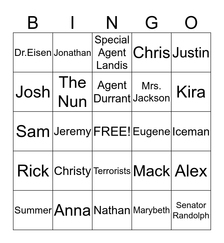 This bingo card has a free space and 24 words: Christy, Anna, Agent Durrant, Summer, Justin, Dr.Eisen, Josh, Jonathan, Eugene, Terrorists, Mrs. Jackson, Sam, Mack, Alex, The Nun, Marybeth, Iceman, Special Agent Landis, Kira, Jeremy, Senator Randolph, Rick, Chris and Nathan.