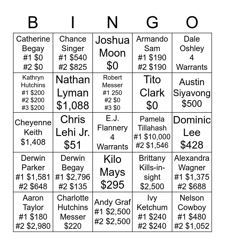 This bingo card has 25 words: Derwin Begay #1 $2,796 #2 $135, Andy Graf #1 $2,500 #2 $2,500, Robert Messer #1 250 #2 $0 #3 $0, Aaron Taylor #1 $180 #2 $2,980, Dale Oshley 4 Warrants, Catherine Begay #1 $0 #2 $0, Kathryn Hutchins #1 $200 #2 $200 #3 $200, Chance Singer #1 $540 #2 $825, Pamela Tillahash #1 $10,000 #2 $1,546, Kilo Mays $295, Tito Clark $0, Cheyenne Keith $1,408, Brittany Kills-in-sight $2,500, Alexandra Wagner #1 $1,375 #2 $688, Nathan Lyman $1,088, Nelson Cowboy #1 $480 #2 $1,052, Dominic Lee $428, Joshua Moon $0, Austin Siyavong $500, Chris Lehi Jr. $51, E.J. Flannery 4 Warrants, Charlotte Hutchins Messer $220, Derwin Parker #1 $1,581 #2 $648, Armando Sam #1 $190 #2 $190 and Ivy Ketchum #1 $240 #2 $240.