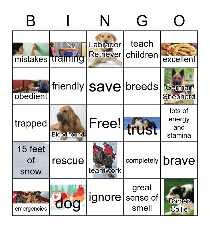 This bingo card has 13 images, a free space and 24 words: rescue, dog, save, emergencies, excellent, mistakes, obedient, training, trust, teamwork, breeds, trapped, completely, brave, friendly, great sense of smell, lots of energy and stamina, Labrador Retriever, German Shepherd, Bloodhound, Border Collie, 15 feet of snow, teach children and ignore.