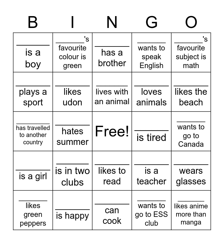 This bingo card has a free space and 24 words: ______ is in two clubs, _______ is happy, _______ lives with an animal, _______ likes green peppers, _______'s favourite subject is math, ______ is a boy, _______ plays a sport, _______'s favourite colour is green, ______ is tired, _______ likes to read, _______ loves animals, __________ has travelled to another country, _______ is a teacher, _______ wears glasses, _______ likes udon, _______ wants to go to ESS club, _______ wants to go to Canada, _______ has a brother, _______ likes the beach, _______ hates summer, _______ likes anime more than manga, _______ is a girl, _______ wants to speak English and _______ can cook.