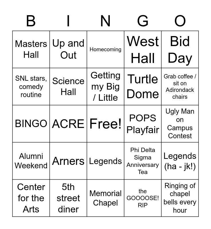 This bingo card has a free space and 56 words: Campus Center, Center for the Arts, Library, Masters Hall, Memorial Chapel, Pushman Cottage, Science Hall, Teel Hall, Turtle Dome, Walton Hall, West Hall, White Chapel, Selwyn Hall, Ponding, Apartment Parties, Spring Fever Weekend, Bid Day, ACRE, Oozeball, Ringing of chapel bells every hour, POPS Playfair, Met my Spouse, Phi Delta Sigma Anniversary Tea, Homecoming, Florida Spring Baseball, Getting my Big / Little, Good Times with Friends/Fraternity, Dance Marathon, Grab coffee / sit on Adirondack chairs, Releasing balloons at Pagoda, Graduation, Choir Concerts, Midnight Breakfast, Airbands, Ugly Man on Campus Contest, SNL stars, comedy routine, BINGO, Concerts in Gym, Alumni Weekend, Up and Out, Legends, Frat House, Shirleys Tequila Bar, Mama's Pizza, The Tap Room, Arners, 5th street diner, Ronie's, The Silo, Sweet Street, the GOOOOSE! RIP, The Brass Lantern! (RIP), Peanut Bar, Starbucks, Legends (ha - jk!) and Pizza Italy (PI).