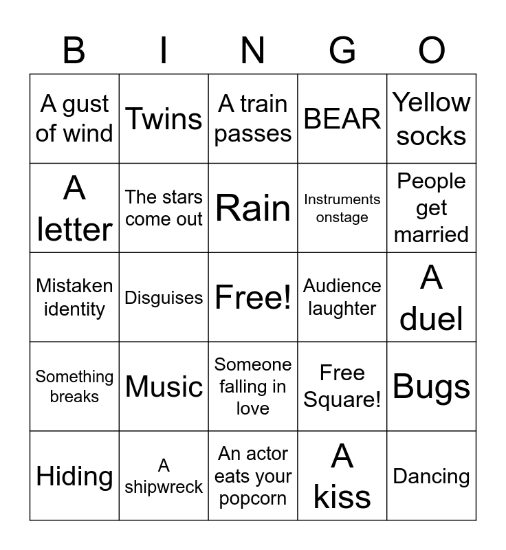 This bingo card has a free space and 25 words: Music, An actor eats your popcorn, Rain, Hiding, Yellow socks, A gust of wind, A letter, Twins, Audience laughter, Someone falling in love, Instruments onstage, Mistaken identity, Free Square!, Bugs, The stars come out, An actor talks to the audience, A duel, A train passes, People get married, Disguises, Dancing, A shipwreck, Something breaks, BEAR and A kiss.