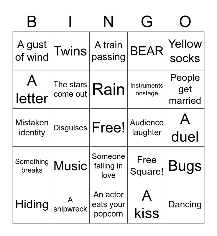 This bingo card has a free space and 25 words: Music, An actor eats your popcorn, Rain, Hiding, Yellow socks, A gust of wind, A letter, Twins, Audience laughter, Someone falling in love, Instruments onstage, Mistaken identity, Free Square!, Bugs, The stars come out, An actor talking to the audience, A duel, A train passing, People get married, Disguises, Dancing, A shipwreck, Something breaks, BEAR and A kiss.