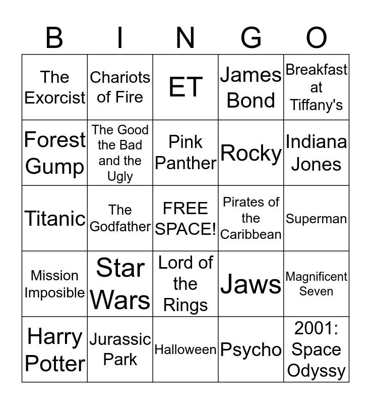 This bingo card has a free space and 24 words: Star Wars, Jurassic Park, Pink Panther, Harry Potter, Breakfast at Tiffany's, The Exorcist, Forest Gump, Chariots of Fire, Pirates of the Caribbean, Lord of the Rings, Rocky, Titanic, Jaws, Magnificent Seven, The Good the Bad and the Ugly, Psycho, Superman, ET, Indiana Jones, The Godfather, 2001: Space Odyssy, Mission Imposible, James Bond and Halloween.