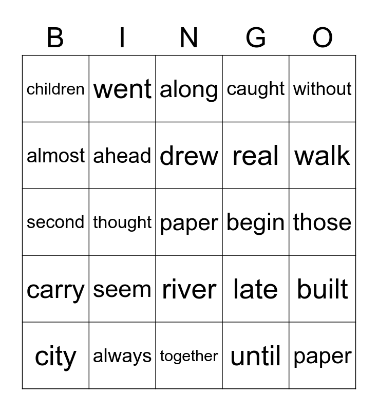 This bingo card has a free space and 29 words: city, earth, thought, above, children, along, ahead, seem, begin, always, those, paper, together, until, walk, white, river, carry, without, second, late, enough, real, almost, caught, went, built, drew and knew.