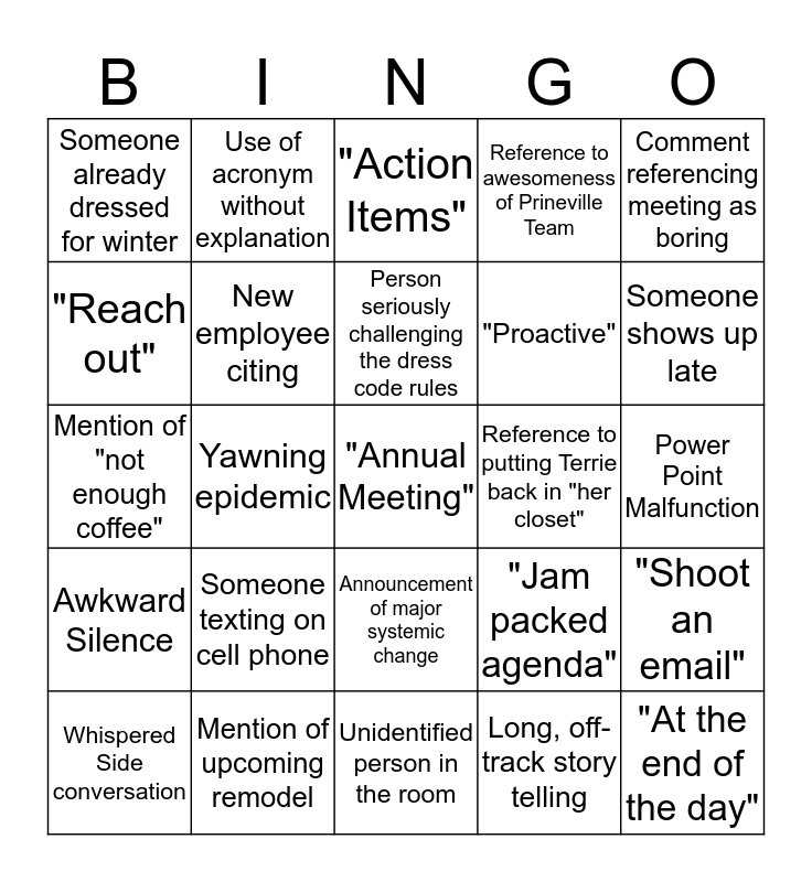 This bingo card has a free space and 24 words: Someone texting on cell phone, Mention of upcoming remodel, Person seriously challenging the dress code rules, Whispered Side conversation, Comment referencing meeting as boring, Someone already dressed for winter, "Reach out", Use of acronym without explanation, Reference to putting Terrie back in "her closet", Announcement of major systemic change, "Proactive", Mention of "not enough coffee", "Jam packed agenda", "Shoot an email", New employee citing, Long, off-track story telling, Power Point Malfunction, "Action Items", Someone shows up late, Yawning epidemic, "At the end of the day", Awkward Silence, Reference to awesomeness of Prineville Team and Unidentified person in the room.