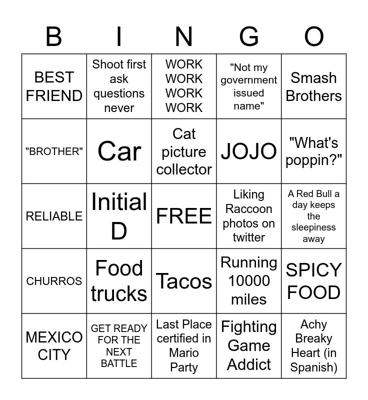 This bingo card has a free space and 24 words: Food trucks, GET READY FOR THE NEXT BATTLE, Cat picture collector, MEXICO CITY, Smash Brothers, BEST FRIEND, "BROTHER", Shoot first ask questions never, Liking Raccoon photos on twitter, Tacos, JOJO, RELIABLE, Running 10000 miles, SPICY FOOD, Car, Fighting Game Addict, A Red Bull a day keeps the sleepiness away, WORK WORK WORK WORK, "What's poppin?", Initial D, Achy Breaky Heart (in Spanish), CHURROS, "Not my government issued name" and Last Place certified in Mario Party.