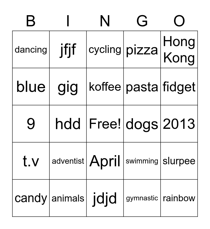 This bingo card has a free space and 24 words: adventist, animals, koffee, candy, Hong Kong, dancing, blue, jfjf, dogs, April, pasta, 9, swimming, slurpee, gig, gymnastic, 2013, cycling, fidget, hdd, rainbow, t.v, pizza and jdjd.