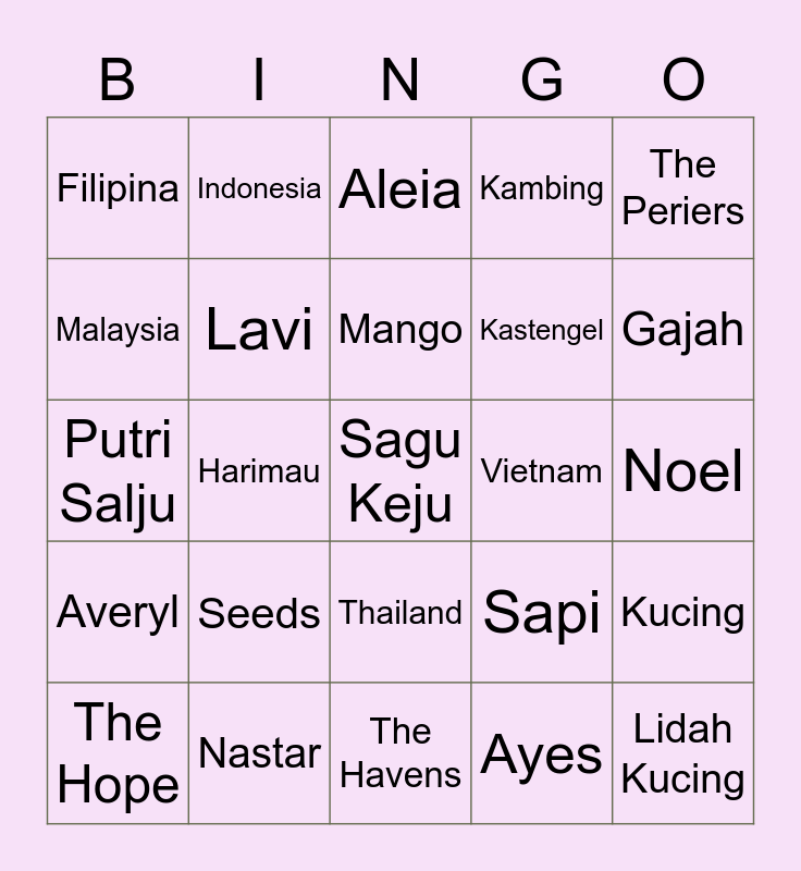 This bingo card has 25 words: Seeds, The Havens, Mango, The Hope, The Periers, Filipina, Malaysia, Indonesia, Vietnam, Thailand, Kastengel, Putri Salju, Sapi, Kucing, Lavi, Lidah Kucing, Noel, Aleia, Gajah, Harimau, Sagu Keju, Nastar, Averyl, Kambing and Ayes.