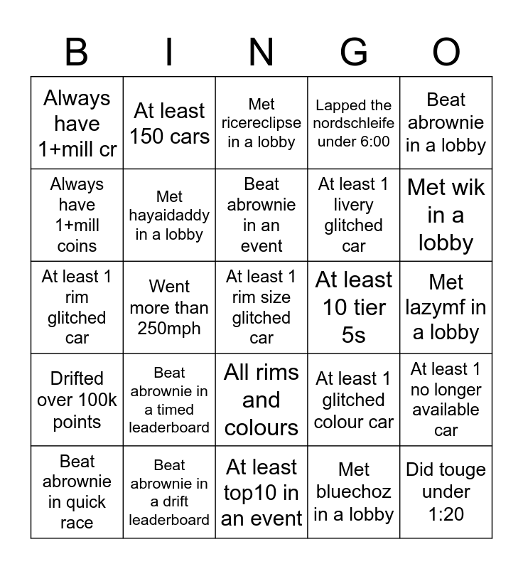 This bingo card has a free space and 24 words: Beat abrownie in a timed leaderboard, Beat abrownie in a drift leaderboard, Beat abrownie in an event, Beat abrownie in quick race, Beat abrownie in a lobby, Always have 1+mill cr, Always have 1+mill coins, At least 150 cars, At least 10 tier 5s, All rims and colours, At least 1 livery glitched car, At least 1 rim glitched car, At least 1 glitched colour car, At least 1 no longer available car, Met hayaidaddy in a lobby, Met bluechoz in a lobby, Met lazymf in a lobby, Met ricereclipse in a lobby, Met wik in a lobby, Went more than 250mph, Did touge under 1:20, Drifted over 100k points, Lapped the nordschleife under 6:00 and At least top10 in an event.