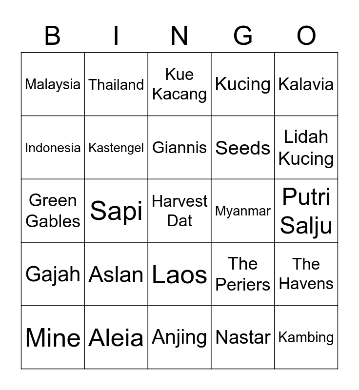 This bingo card has a free space and 24 words: Aslan, Aleia, Giannis, Mine, Kalavia, Malaysia, Indonesia, Thailand, Myanmar, Laos, Seeds, Green Gables, The Periers, The Havens, Kastengel, Nastar, Putri Salju, Kue Kacang, Lidah Kucing, Sapi, Kambing, Gajah, Kucing and Anjing.