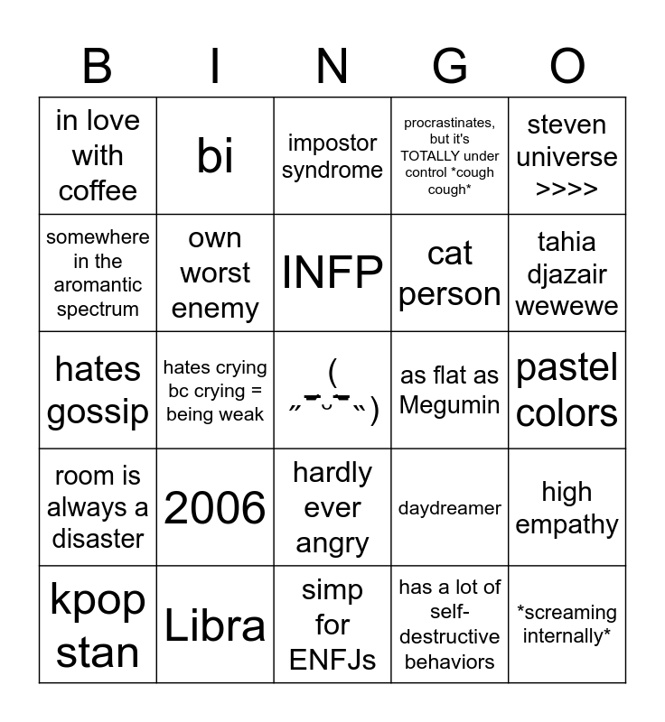 This bingo card has a free space and 24 words: 2006, Libra, INFP, kpop stan, steven universe >>>>, in love with coffee, somewhere in the aromantic spectrum, bi, as flat as Megumin, hardly ever angry, cat person, hates gossip, daydreamer, high empathy, own worst enemy, has a lot of self-destructive behaviors, pastel colors, impostor syndrome, tahia djazair wewewe, hates crying bc crying = being weak, *screaming internally*, room is always a disaster, procrastinates, but it's TOTALLY under control *cough cough* and simp for ENFJs.