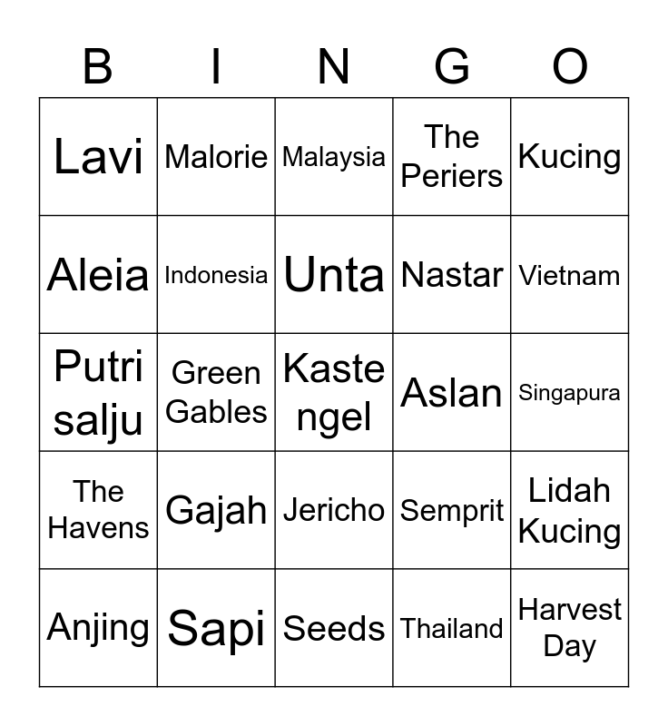 This bingo card has a free space and 24 words: Gajah, Sapi, Unta, Anjing, Kucing, Lavi, Aleia, Malorie, Aslan, Jericho, Nastar, Putri salju, Semprit, Lidah Kucing, Indonesia, Thailand, Singapura, Malaysia, Vietnam, Green Gables, Harvest Day, The Havens, The Periers and Seeds.