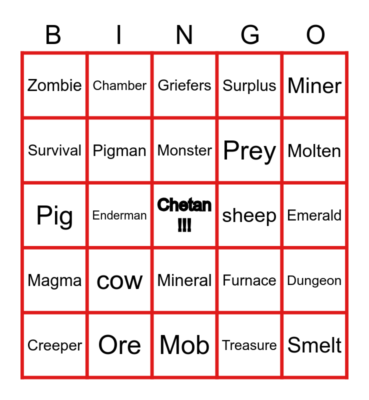 This bingo card has a free space and 29 words: Creeper, Spider, Enderman, Skeleton, Zombie, Griefers, Pigman, cow, sheep, Ore, Emerald, Smelt, Mob, Treasure, Molten, Trade, Mineral, Magma, Miner, Pig, Furnace, Enchant, Prey, Survival, Surplus, Chamber, Dungeon, Monster and Farming.