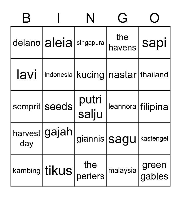 This bingo card has a free space and 24 words: gajah, tikus, kucing, kambing, sapi, delano, lavi, aleia, leannora, giannis, nastar, semprit, sagu, kastengel, indonesia, malaysia, filipina, singapura, thailand, seeds, green gables, harvest day, the havens and the periers.