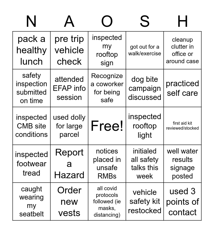 This bingo card has a free space and 24 words: Report a Hazard, Order new vests, Recognize a coworker for being safe, caught wearing my seatbelt, cleanup clutter in office or around case, pack a healthy lunch, safety inspection submitted on time, pre trip vehicle check, inspected rooftop light, notices placed in unsafe RMBs, dog bite campaign discussed, inspected CMB site conditions, initialed all safety talks this week, well water results signage posted, attended EFAP info session, vehicle safety kit restocked, first aid kit reviewed/stocked, inspected my rooftop sign, practiced self care, used dolly for large parcel, used 3 points of contact, inspected footwear tread, got out for a walk/exercise and all covid protocols followed (ie masks, distancing).