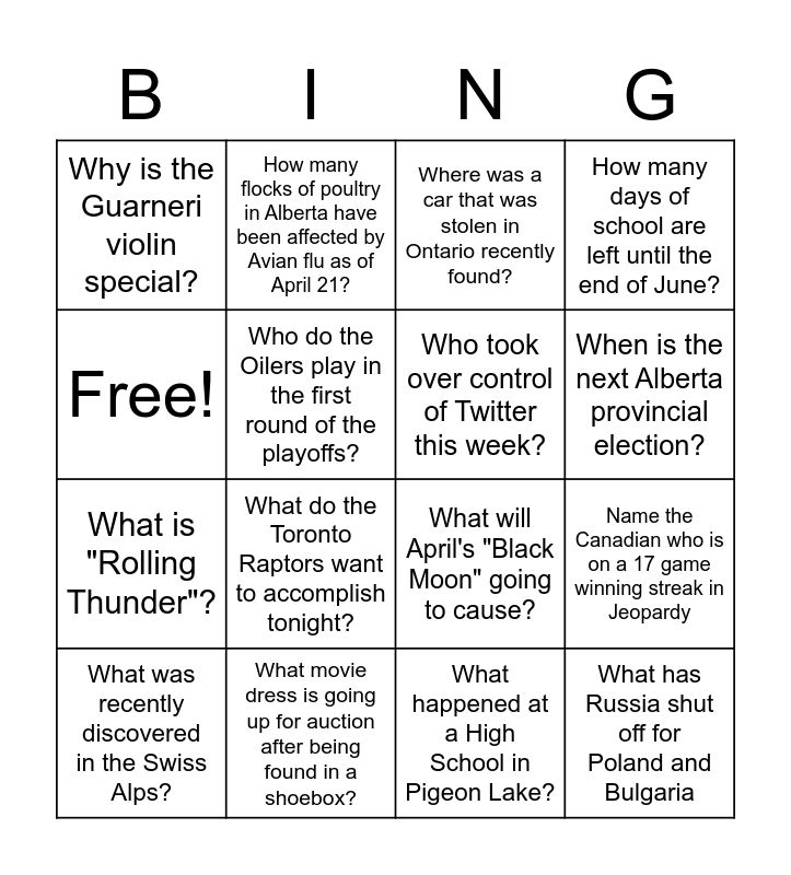 This bingo card has 16 words: What movie dress is going up for auction after being found in a shoebox?, Name the Canadian who is on a 17 game winning streak in Jeopardy, Where was a car that was stolen in Ontario recently found?, Why is the Guarneri violin special?, What is "Rolling Thunder"?, How many flocks of poultry in Alberta have been affected by Avian flu as of April 21?, What will April's "Black Moon" going to cause?, What happened at a High School in Pigeon Lake?, Free!, Who do the Oilers play in the first round of the playoffs?, What was recently discovered in the Swiss Alps?, How many days of school are left until the end of June?, What do the Toronto Raptors want to accomplish tonight?, When is the next Alberta provincial election?, Who took over control of Twitter this week? and What has Russia shut off for Poland and Bulgaria.