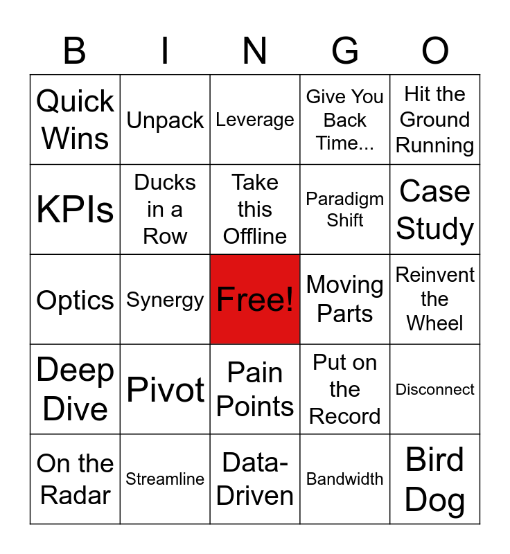This bingo card has a free space and 32 words: Bandwidth, Bang for Your Buck, Synergy, Circle Back, Deep Dive, Ducks in a Row, Hit the Ground Running, Disconnect, Unpack, Circle Back, Take this Offline, Leverage, Wheelhouse, Move the Needle, Moving Parts, No Brainer, On the Radar, Optics, Pain Points, Pivot, Put on the Record, At the End of the Day.., Reinvent the Wheel, Streamline, Bird Dog, Give You Back Time..., Paradigm Shift, KPIs, Quick Wins, Data-Driven, Stake Holder and Case Study.