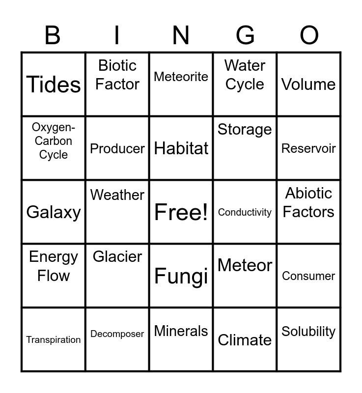 This bingo card has a free space and 24 words: Glacier, Decomposer, Habitat, Transpiration, Volume, Tides, Oxygen- Carbon Cycle, Biotic Factor, Conductivity, Fungi, Storage, Galaxy, Meteor, Consumer, Producer, Climate, Abiotic Factors, Meteorite, Reservoir, Weather, Solubility, Energy Flow, Water Cycle and Minerals.