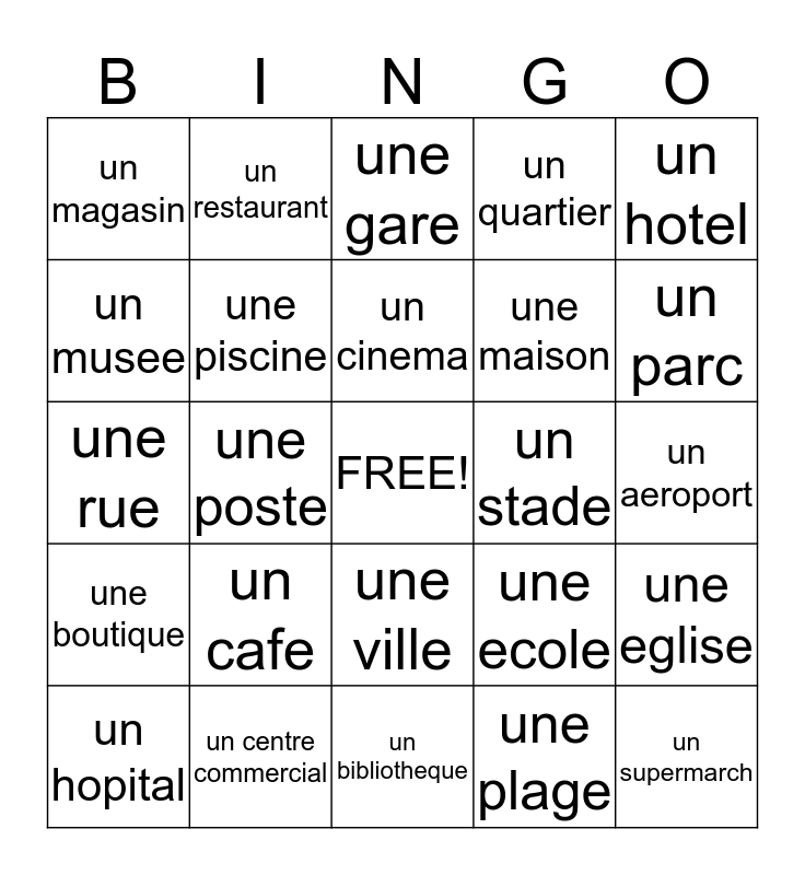 This bingo card has a free space and 24 words: un cafe, un centre commercial, un cinema, un hopital, un hotel, un magasin, un musee, un restaurant, un stade, une ville, une maison, une rue, une ecole, une eglise, une piscine, une plage, un aeroport, une gare, un parc, une poste, un supermarch, une boutique, un quartier and un bibliotheque.