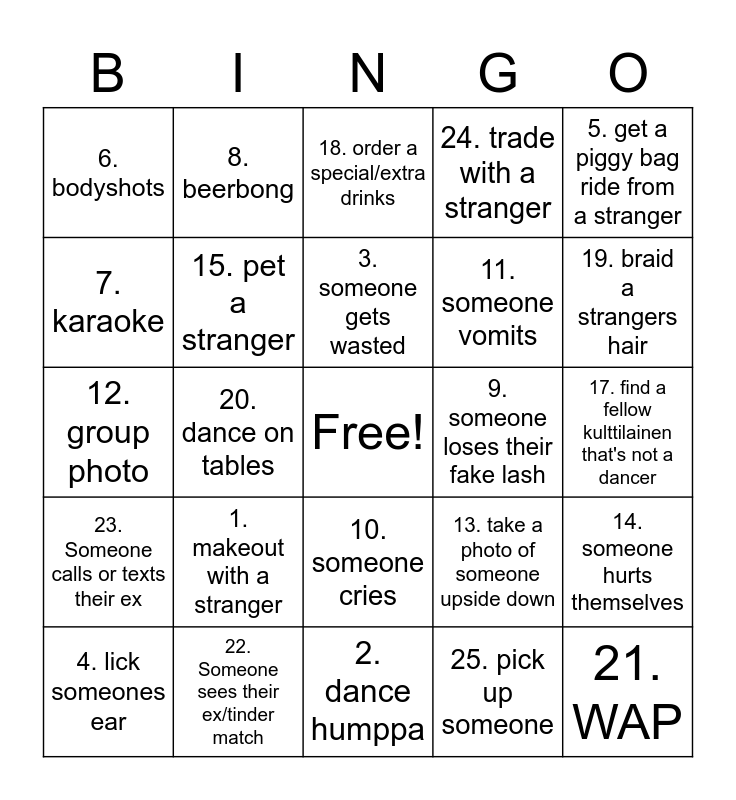 This bingo card has a free space and 25 words: 1. makeout with a stranger, 2. dance humppa, 3. someone gets wasted, 4. lick someones ear, 5. get a piggy bag ride from a stranger, 6. bodyshots, 7. karaoke, 8. beerbong, 9. someone loses their fake lash, 10. someone cries, 11. someone vomits, 12. group photo, 13. take a photo of someone upside down, 14. someone hurts themselves, 15. pet a stranger, 16. someone gets a free drink, 17. find a fellow kulttilainen that's not a dancer, 18. order a special/extra drinks, 19. braid a strangers hair, 20. dance on tables, 21. WAP, 22. Someone sees their ex/tinder match, 23. Someone calls or texts their ex, 24. trade with a stranger and 25. pick up someone.