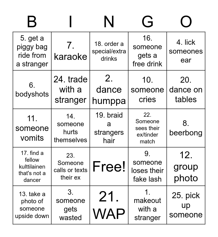 This bingo card has 26 words: Free!, 1. makeout with a stranger, 2. dance humppa, 3. someone gets wasted, 4. lick someones ear, 5. get a piggy bag ride from a stranger, 6. bodyshots, 7. karaoke, 8. beerbong, 9. someone loses their fake lash, 10. someone cries, 11. someone vomits, 12. group photo, 13. take a photo of someone upside down, 14. someone hurts themselves, 15. pet a stranger, 16. someone gets a free drink, 17. find a fellow kulttilainen that's not a dancer, 18. order a special/extra drinks, 19. braid a strangers hair, 20. dance on tables, 21. WAP, 22. Someone sees their ex/tinder match, 23. Someone calls or texts their ex, 24. trade with a stranger and 25. pick up someone.