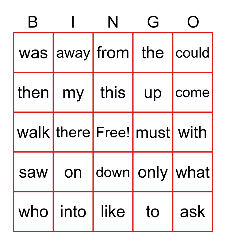 This bingo card has a free space and 24 words: on, into, this, who, could, was, then, away, must, down, up, walk, only, what, my, to, with, from, come, there, ask, saw, the and like.