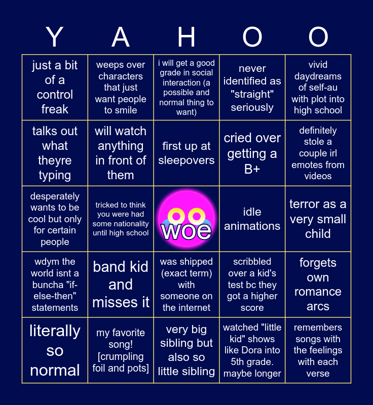 This bingo card has a free space and 34 words: wanted to be a fairy / mermaid so bad, watched "little kid" shows like Dora into 5th grade. maybe longer, had no experience with pop music for a While., missing father behavior, wdym the world isnt a buncha "if-else-then" statements, will watch anything in front of them, vivid daydreams of self-au with plot into high school, literally so normal, weeps over characters that just want people to smile, little guys <33, first up at sleepovers, i will get a good grade in social interaction (a possible and normal thing to want), if only i could change my 3d model, wants every aesthetic at once, idle animations, definitely stole a couple irl emotes from videos, my favorite song! [crumpling foil and pots], desperately wants to be cool but only for certain people, band kid and misses it, scribbled over a kid's test bc they got a higher score, was shipped (exact term) with someone on the internet, immediately goes to hard difficulty in every rhythm game, just a bit of a control freak, terror as a very small child, very big sibling but also so little sibling, remembers songs with the feelings with each verse, never identified as "straight" seriously, wants goggles as an accessory, cried over getting a B+, talks out what theyre typing, squeamy with bugs up close, tricked to think you were had some nationality until high school, forgets own romance arcs and never show me an autistic scientist.