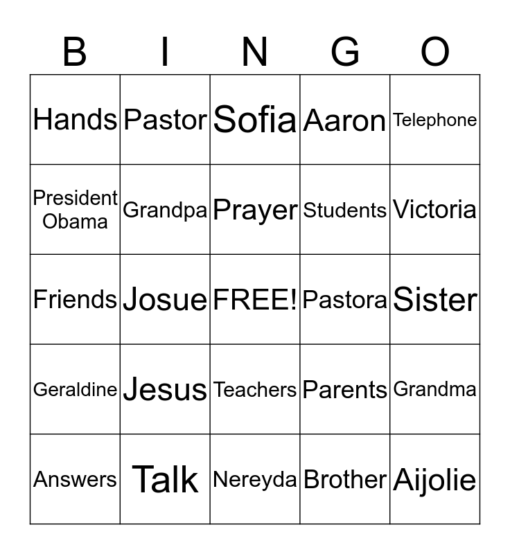 This bingo card has a free space and 24 words: Jesus, Talk, Prayer, Answers, Telephone, Hands, President Obama, Pastor, Pastora, Teachers, Students, Friends, Parents, Grandma, Grandpa, Brother, Sister, Sofia, Victoria, Josue, Aijolie, Geraldine, Aaron and Nereyda.