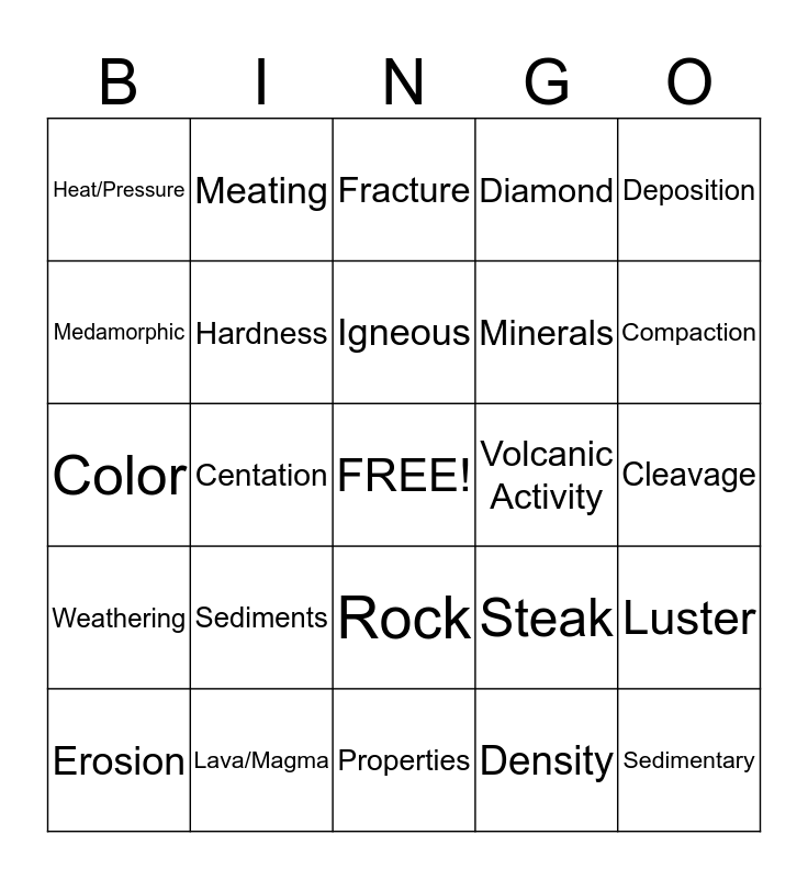 This bingo card has a free space and 24 words: Sediments, Lava/Magma, Igneous, Erosion, Deposition, Heat/Pressure, Medamorphic, Meating, Volcanic Activity, Rock, Minerals, Color, Steak, Luster, Hardness, Density, Cleavage, Fracture, Compaction, Centation, Sedimentary, Weathering, Diamond and Properties.