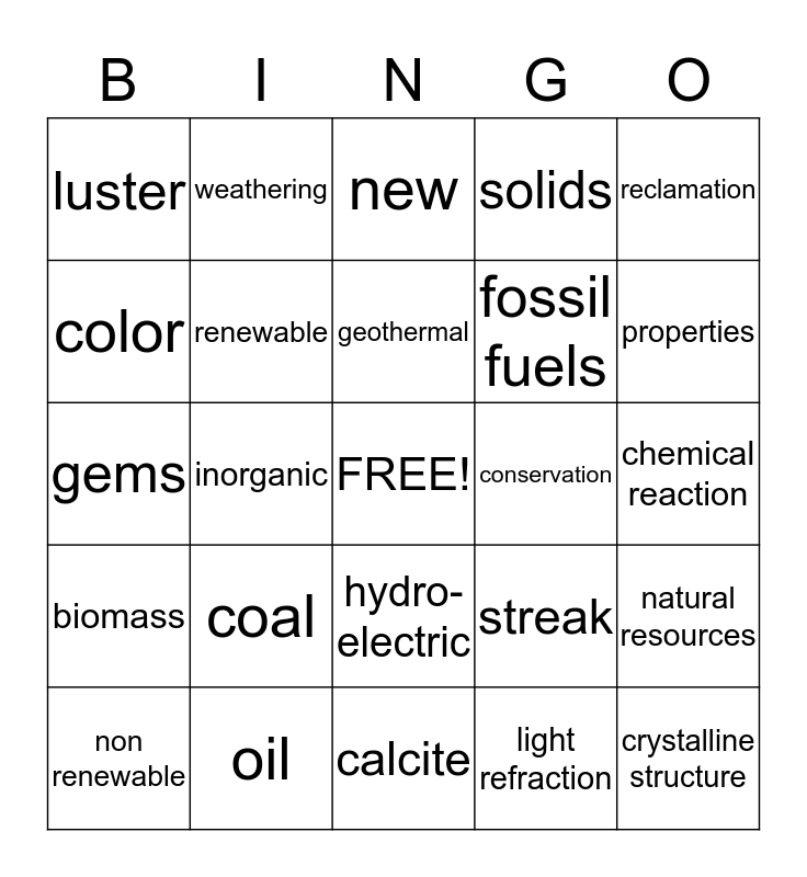 This bingo card has a free space and 24 words: coal, oil, geothermal, non renewable, reclamation, luster, color, weathering, conservation, hydro- electric, fossil fuels, gems, streak, natural resources, renewable, light refraction, chemical reaction, new, properties, inorganic, crystalline structure, biomass, solids and calcite.