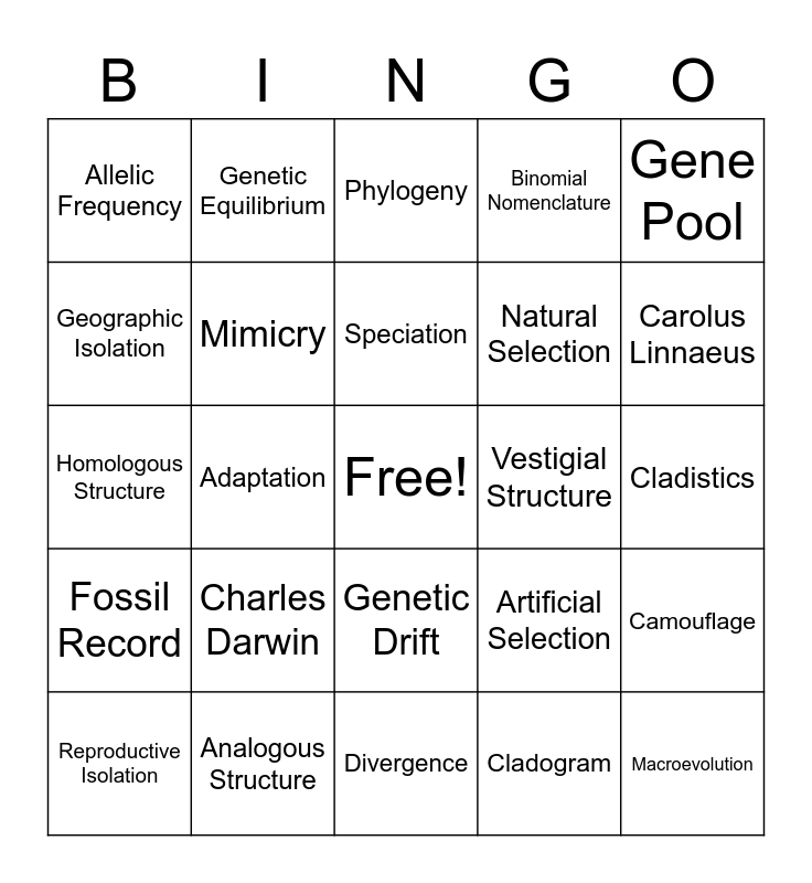 This bingo card has a free space and 24 words: Charles Darwin, Analogous Structure, Speciation, Reproductive Isolation, Gene Pool, Allelic Frequency, Geographic Isolation, Genetic Equilibrium, Vestigial Structure, Genetic Drift, Natural Selection, Homologous Structure, Artificial Selection, Camouflage, Mimicry, Cladogram, Cladistics, Phylogeny, Carolus Linnaeus, Adaptation, Macroevolution, Fossil Record, Binomial Nomenclature and Divergence.