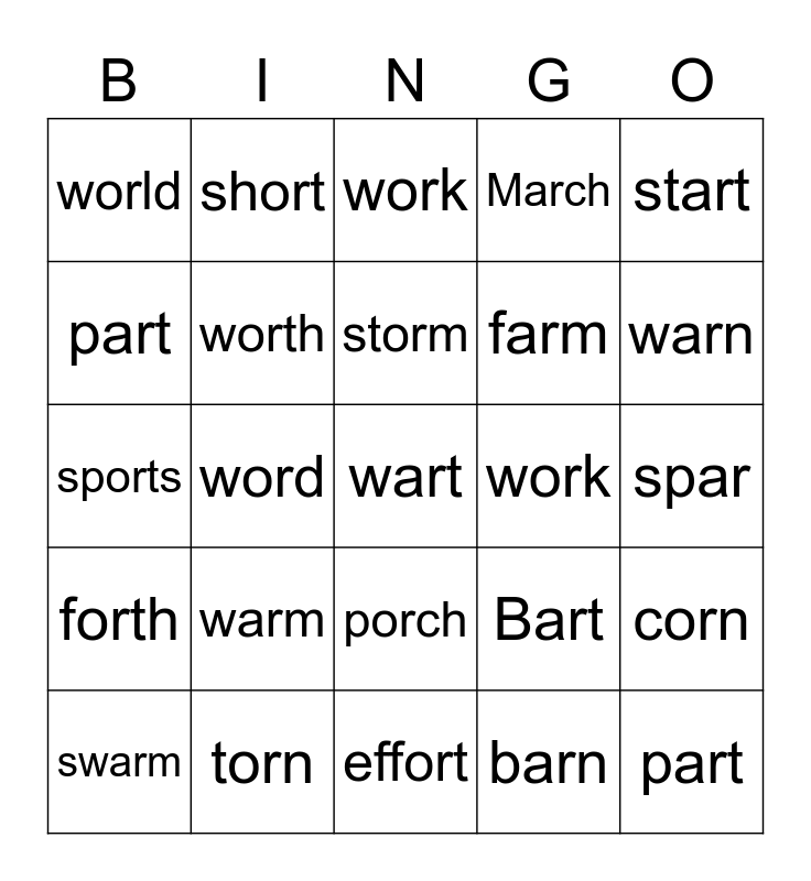 This bingo card has a free space and 24 words: warm, torn, storm, swarm, start, world, part, short, work, porch, farm, sports, Bart, corn, worth, barn, spar, work, warn, word, part, forth, March and effort.