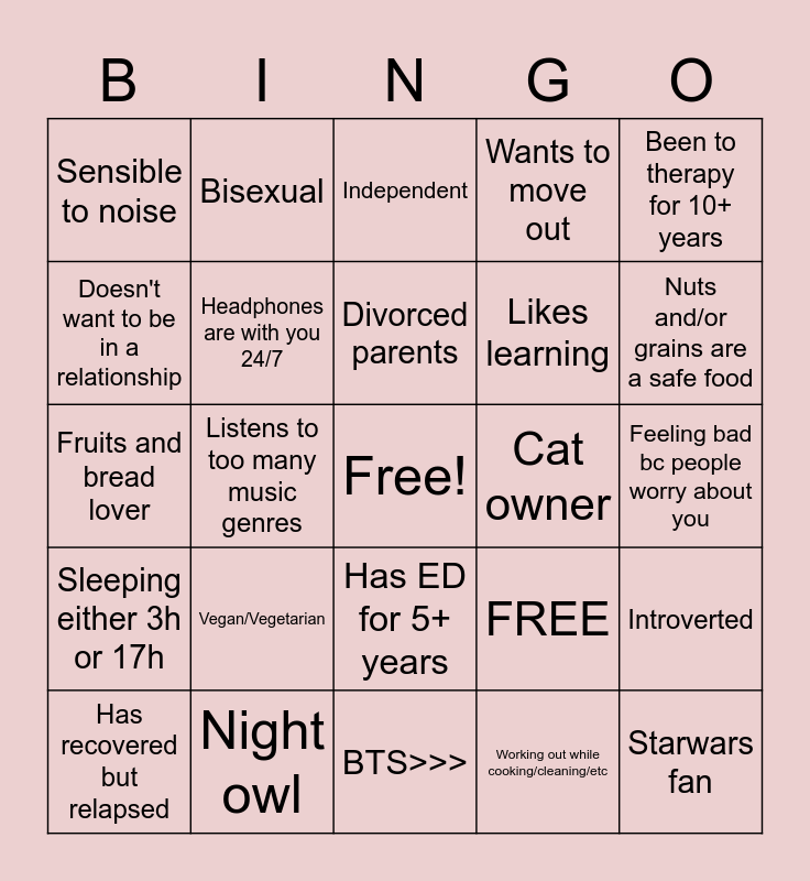 This bingo card has a free space and 25 words: Vegan/Vegetarian, BTS>>>, Divorced parents, Has recovered but relapsed, Been to therapy for 10+ years, Sensible to noise, Doesn't want to be in a relationship, Bisexual, Cat owner, Has ED for 5+ years, Likes learning, Fruits and bread lover, FREE, Introverted, Headphones are with you 24/7, Picks up litter from stragers, Feeling bad bc people worry about you, Independent, Nuts and/or grains are a safe food, Listens to too many music genres, Starwars fan, Night owl, Sleeping either 3h or 17h, Wants to move out and Working out while cooking/cleaning/etc.