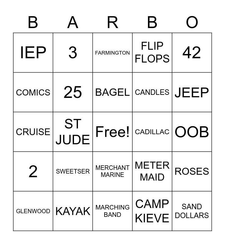 This bingo card has a free space and 34 words: WALKING, CAMP KIEVE, PURPLE, TULIPS, 2, 25, 42, GLENWOOD, 3, SHREWSBURY, BAGEL, FARMINGTON, FASHIONISTA, FRENCH, CADILLAC, JEEP, KAYAK, CRUISE, SWEETSER, METER MAID, MERCHANT MARINE, DANCES, IEP, OOB, MARCHING BAND, SAND DOLLARS, FLIP FLOPS, MUDSLIDES, CANDLES, COMICS, BOSTON, ST JUDE, ROSES and GREEN.