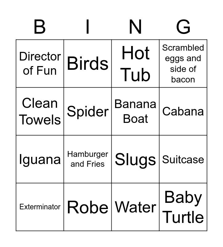 This bingo card has 16 words: Robe, Suitcase, Hot Tub, Director of Fun, Iguana, Birds, Slugs, Water, Clean Towels, Spider, Exterminator, Scrambled eggs and side of bacon, Hamburger and Fries, Cabana, Banana Boat and Baby Turtle.