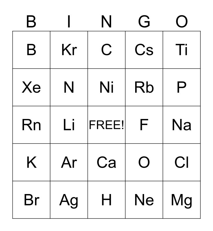 This bingo card has a free space and 31 words: H, He, Li, Be, B, C, N, O, F, Ne, Na, Mg, Al, Si, P, S, Cl, Ar, K, Ca, Ti, Zn, Br, Kr, Rb, Xe, Cs, Rn, Ag, Ni and Cu.