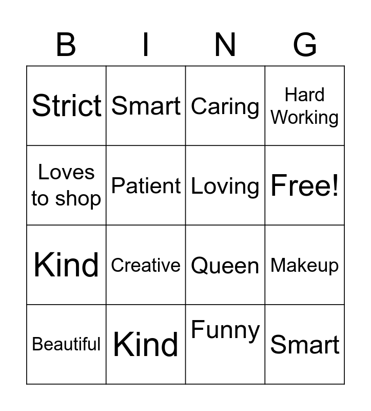 This bingo card has 17 words: Funny, Beautiful, Caring, Strict, Creative, Hard Working, Makeup, Loving, Free!, Patient, Kind, Queen, Loves to shop, Smart, Kind, Amazing and Smart.